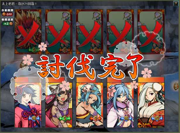 札枠を空けるために10枚ほど雪女を五行にし、ぴぎゃーぴぎゃーと心の中で叫びつつ羅刹を作り溜め、メンテ後に茨木生産開始&五行化。