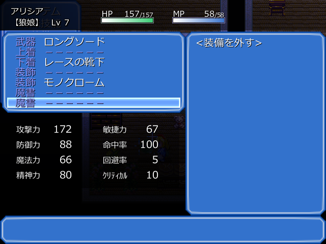 モノクロームが初期武器。モノクロームはアリシア専用で、他にスライムボディやバックラーなどの盾やレフトハンドなどの一部武器が装飾二番に装備できる。