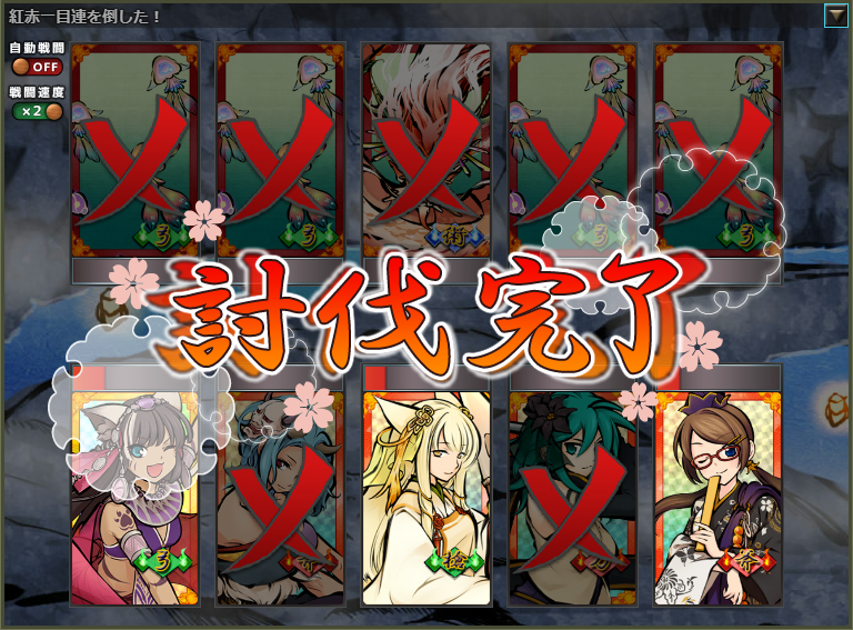 ぼくの場合、強力な連撃持ちの老君・改とファラ・改がいるので、道中はそこまで苦労せず。ボスも、刀属性の煙々羅が囮の心得で老君や超かるらの攻撃を吸い寄せてしまって早々に退場、暮霧暮霧団が囮と鉄壁で時間を稼ぎつつ化猫太夫が回復で支援するも数の暴力には勝てず、こちらの犠牲は1~3人程度で圧勝、という感じ。初討伐時はファラに全体攻撃狙いがついていたせいか暮霧暮霧団に攻撃が集中したけど、そのあとは毎回煙々羅が先に沈んでる。1回の討伐にかかるコストは30超えてるけれど、1日3回だしまあ……と言ったところ。予備戦力を減らせそうなのでたぶん30より少なくできるし。
