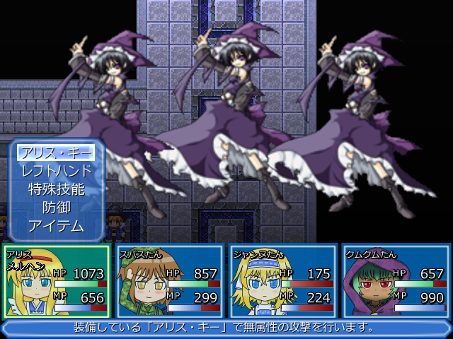 ナキリたんのみメルヘン可にして他3人は全異常無効装備でナキリたんを全力サポート。ナキリたんに暗闇だけは耐性つけられなかったのでアリスは目薬担当。
