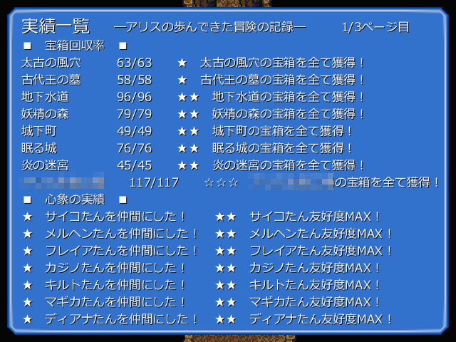 これから引継ぎプレイをする人で、挑戦部屋で楽をしたい人は、第七機関やアリスドレスなどの耐性パズルに使える一品物を優先して引き継いできた方がいいです。ただし、ドリームロリータの耐性は打電なので、トライオンを複数買えることを考えると優先度は低いです。交換部屋のアイテムを引き継いで開始直後に交換して俺TUEEEもいいけど、本編の攻略が早く楽になるだけで、最終的には引き継がなかった場合と何も変わりません。