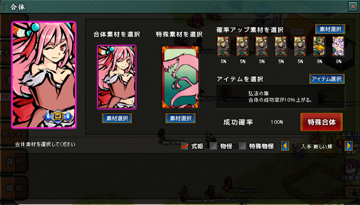 おゆきを選んだのは、単に合体用の祠で落ちる素材が術用と回用以外なかったから。斧があれば、五行用に茨木を作ったときにそれて紅葉になってしまったやつを利用できたんだけど持ってなかった。素材を掘りにいくのといすずを作るのどっちが楽かって言ったらいすず。