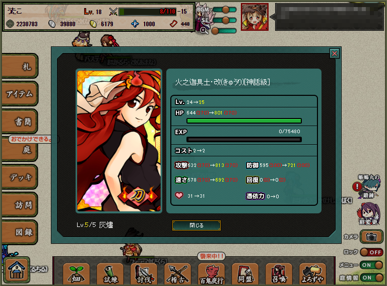 この姫は最初、「基本種の憑依力を上げてから合体してって最終的に憑依力カンストの超膝丸作ろうぜwwwww」って思ってたら上級種の合体のところでレア化してしまい、とりあえず天々羽斬・改にしたところで飽きて、その後、刀の憑依ってあまり使わなくね?と気づいてそのまま放置されてたやつ。以前(ほぼ1年前のこの記事んとき)に1コスの超天々羽斬・改を作ったときに、うっかりミスのせいで1枚余った超・天々羽斬がいて、急所打ち用にするからとかなんとか言ってたのに結局使わなくて百鬼専用になっていたので素材になってもらった。超化用の素材に使える天々羽斬・改も持ってたしね。ステさえ盛れればおk憑依効果なんて別にいらねえ!って感じのかけあい討伐地とか種族限定討伐地とかで活躍してもらおう。