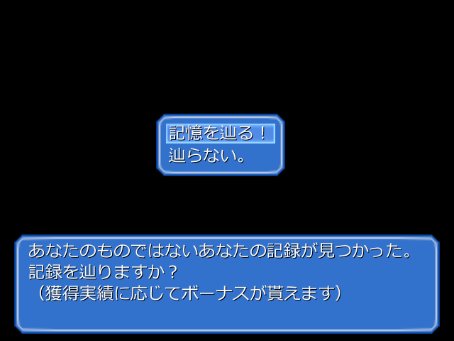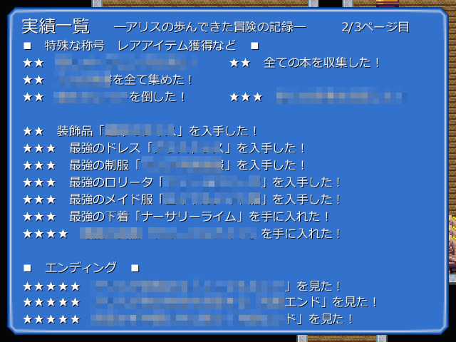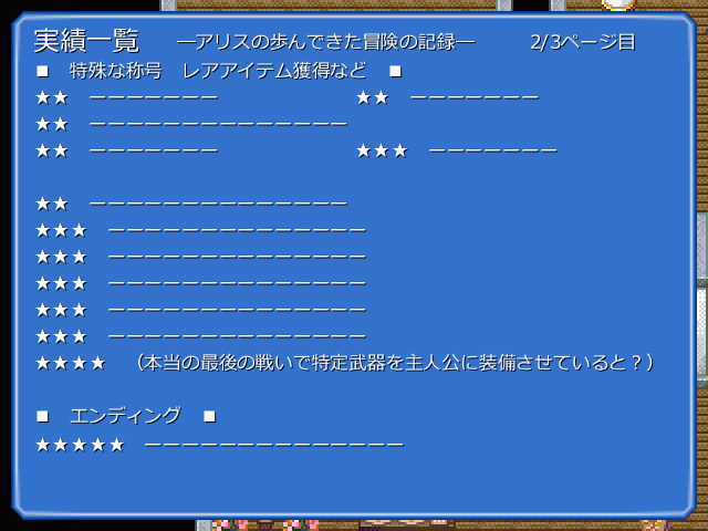 イストワールは引継ぎポイントを集めて、そのセーブデータで拾ったアイテムを引き継いで次の周へ……って感じだったけれど、ALICEHOLEでは通常のセーブデータとは別に実績が記録されているセーブデータがあり、新規で始めるときに実績を参照してボーナスアイテムを手に入れてから開始、みたいな感じ。なので厳密に言えば周回ではない、かな。