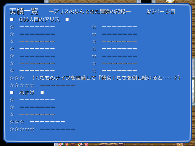 イストワールは引継ぎポイントを集めて、そのセーブデータで拾ったアイテムを引き継いで次の周へ……って感じだったけれど、ALICEHOLEでは通常のセーブデータとは別に実績が記録されているセーブデータがあり、新規で始めるときに実績を参照してボーナスアイテムを手に入れてから開始、みたいな感じ。なので厳密に言えば周回ではない、かな。