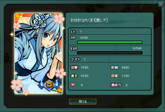 おゆきを選んだのは、単に合体用の祠で落ちる素材が術用と回用以外なかったから。斧があれば、五行用に茨木を作ったときにそれて紅葉になってしまったやつを利用できたんだけど持ってなかった。素材を掘りにいくのといすずを作るのどっちが楽かって言ったらいすず。
