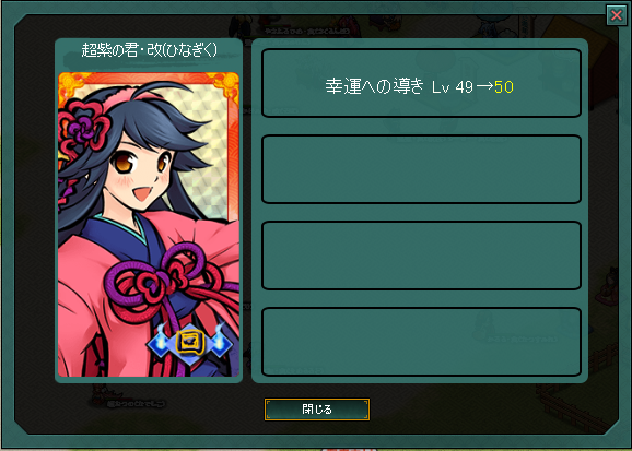 あとはバステト改の強化。超化しようと思ったら微妙に足りなかった(舶来レアの型紙使えばいけるけど既に超バステトが1人いるので他に使いたい)から五月雨打ち覚えさせて周回用にした……のはいいものの、HPの強化が甘いので運が悪いと鵺で落ちる。落ちても問題ないけどね。それよりも憑依姫の育成で雑魚の殲滅速度を上げたいところ。属性的に不利な火之迦具土もたまに落ちるけれど、灰燼+博打打ちで属性の不利なんてものともせず雑魚をばしばししばいてくれるので、外すことはないかな。憑依姫が育ったら耐えてくれるだろうきっと。そこまで育ったら囮いらなくね?とも思ったけど、たぶん超紫が落ちる(そして幸運持ちだから落ちるのは困る)のでやっぱり囮は必要だね。